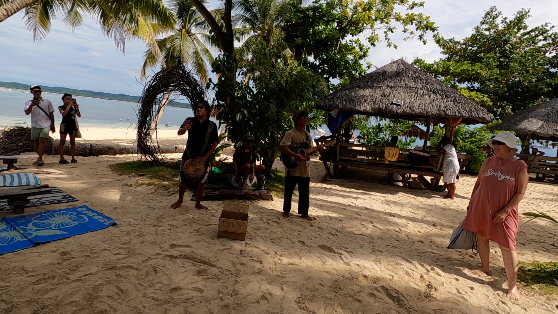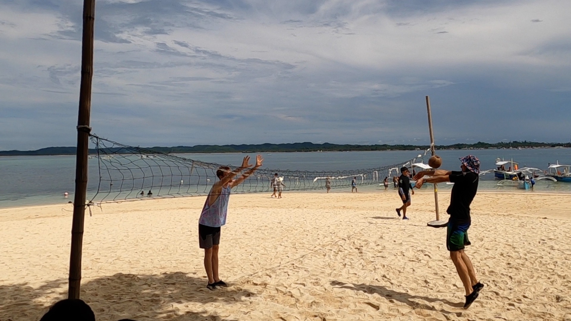 Flo contacted us early to see if we wanted to go out on the boats for an Island tour. We said count us in, we got organised in record time and made our way out to the launch site, which was just in front of the wet markets. Christine and Scotty were starting to come down with some type of flu, but they were still up for the adventure. We met up with our guide, Angelo, and our captain, Albert, at the wet markets and took the boat out to a small nearby island named Guyam Island. This island was tiny with only two dwellings, a volleyball net and a handful of coconut palms dotted around it. A small band of musicians had set up to play music for the tourists. Christine and I danced some salsa while we listened to the music, Angelo filmed us dancing while he was giving a commentary of the island tours. While we were walking around the island we had come across a number of coconuts that had been drained of their contents and had been left to dry out in the sun. These coconuts were hollow and light. I mistakenly thought that Byron had picked up one of these coconuts, I suggested that he pip it over the Volleyball net and I would return it. We could make an amusing video about us using coconuts to play volleyball, it wasn’t until I went to return it that I realised that the coconut was actually a full coconut that had simply changed colour after falling from the tree and being left in the sun. A great, if not a little painful, video.