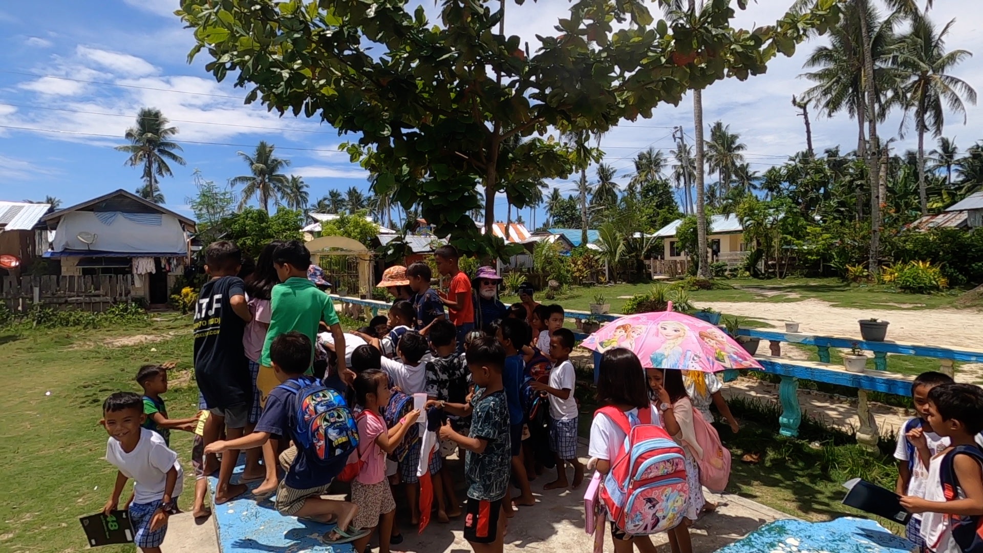 By this time we were starting to work up an appetite, so we once again set sail, this time we made our way over to the main island where there were many dwellings, a school and a small community. Angelo took us to the school so that we could hand out some clothes books and stationary that we had brought over. Christine had purchased these supplies in Australia and had sent them to the Philippines with Flo. We did not anticipate quite how many students there would be on the islands, and we had only brought a part of one of the bags. We organised with Angelo to get him the other half of the goodies the next day.