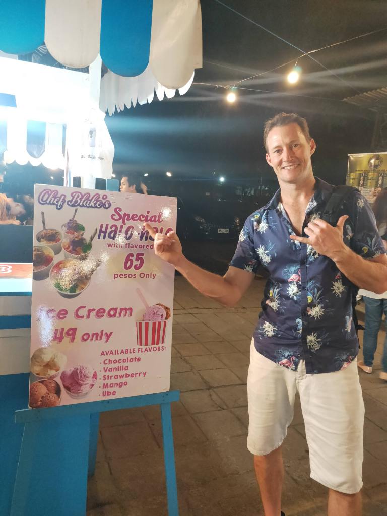After a rest and some dinner, we went for a walk to do some exploring. This is when we discovered the night food market. We saw Scotty on the way and he said that the market was so big he had gotten lost in it. We wandered up and down the isles of fried baked and blended foods. The market had a stage set up in the middle of it all where a band was cranking out music using the local dialogue. We picked up a blended banana and mango smoothie and then continued on our way. We walked around the It park and checked out the sights and sounds of the local businesses and people going about their lives. We found another small food market a few streets away, it also had a stage set up for live music, but on this night there was no band playing. This is where we found chef Blake’s halo halo stall. We decided that we would come back another night to check it out.