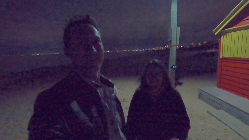 In the afternoon we took it upon ourselves to go on a mission to see the Brighton Beach Huts at of all places, Brighton Beach. Now it would later turn out that we could have simply caught a 20min train ride from Finders Station but that wouldn’t have been anywhere near as much fun. Instead we caught a tram as far as we could, then walked for ages, rode a scooter through some pretty dodgy traffic, something we would certainly have told the kids off for if they tried it, and then walked some more. We arrived well after dark, thankfully they have lighting at either end of the beach huts so we were still able to get a photograph with the beach huts. We then decided it was time to find some food before trying to figure out how to get back to the city.