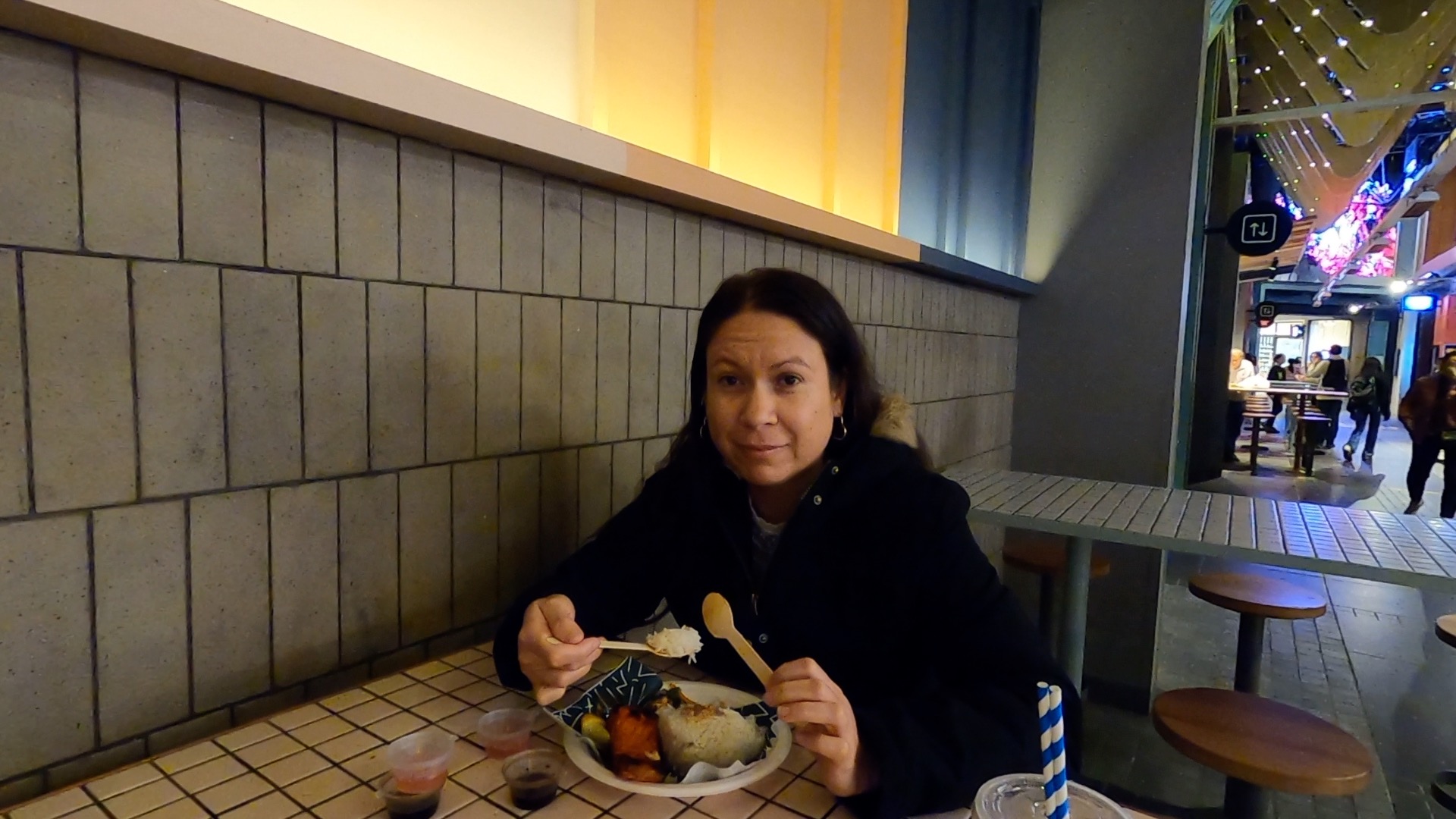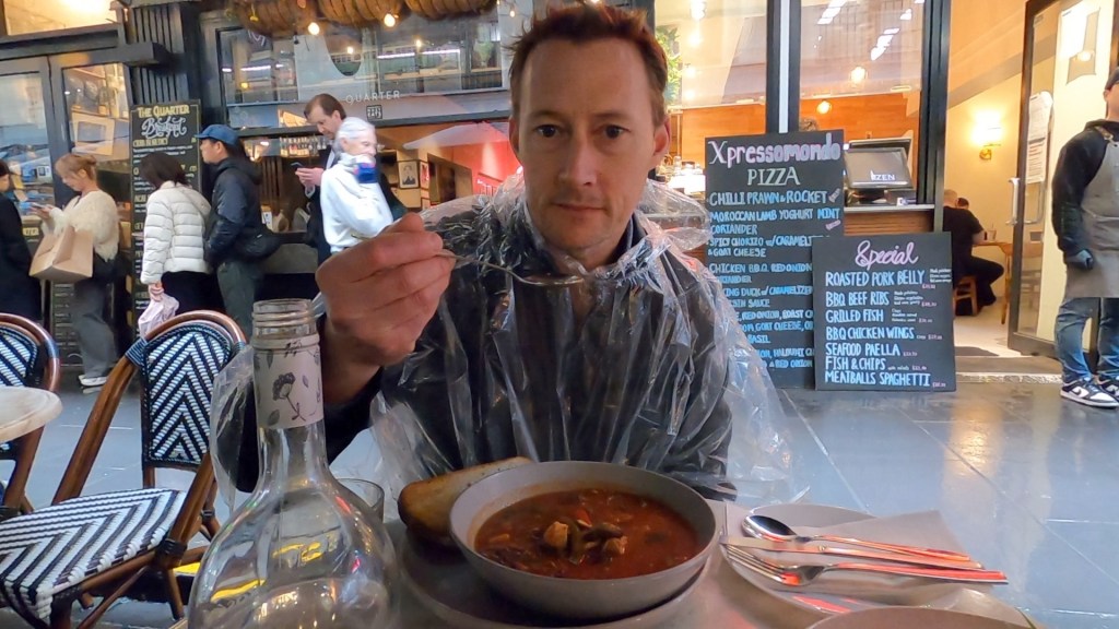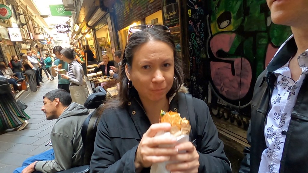 Once we were done with the Southbank precinct we decided to get some lunch from Degraves street. We settled on a place that was serving vegetable soup, due to the weather we were able to sit in the middle of Degraves street under the umbrellas which were doing a reasonable job of keeping the rain off. In reality if we were after soup we should have gone to the soup place that is right next to the shop where we got our Vietnamese pork rolls the day before. This will be on the menu for our next Melbourne adventure.