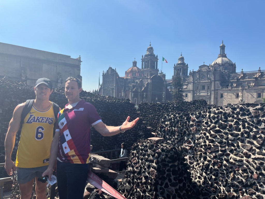 I got up at around 8am, it was still dark outside as it is the middle of winter here in Mexico at this time of year. I did some yoga in the living room while I watched the sun rise over Mexico. It was at this point that I realised how exciting it was to finally be in Mexico City watching the sun rise and taking in the sights and sounds of Mexico City at that time of the morning. I have wanted to travel to Mexico since I was a teenager, and here 30 years later, 15 of which had been spent learning Spanish, I had finally achieved that goal. I then smashed out some Duolingo while I waited for Christine to get up. When Christine got up we went looking for one of the bakeries that we had seen when we were out exploring last night. Alas we did not find the one I was looking for, we did find a cafe that sold over priced bagels, we picked up three bagels, a coffee and a hot chocolate. The whole lot cost around $35 Australian, outrageous for Mexico. We returned to the accomodation and cooked up eggs with avocado and bagels for breakfast, we also made up cereal with banana. Once we were done with breakfast we cleaned up the gourmet kitchen, had showers and ordered an Uber to take us over to Zocalo Square.