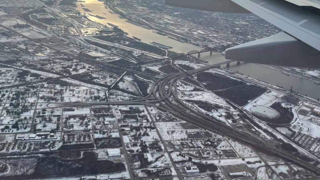 We flew to Saint Louis, a city in the centre of the US in the state Missouri. As we flew in over the city we could see that all of the outlaying farmland, buildings and houses were covered in a thick layer of snow, any large volumes of still water were frozen solid. After we landed we could see a large pile of snow under the Aerobridge. Luke was the only person in the place wearing a basketball singlet and a pair of shorts, everybody was stopping to take a look. We took the opportunity to hunt down some more food. This time we asked for chicken and salad baguettes and ended up with chicken and salad bagels.