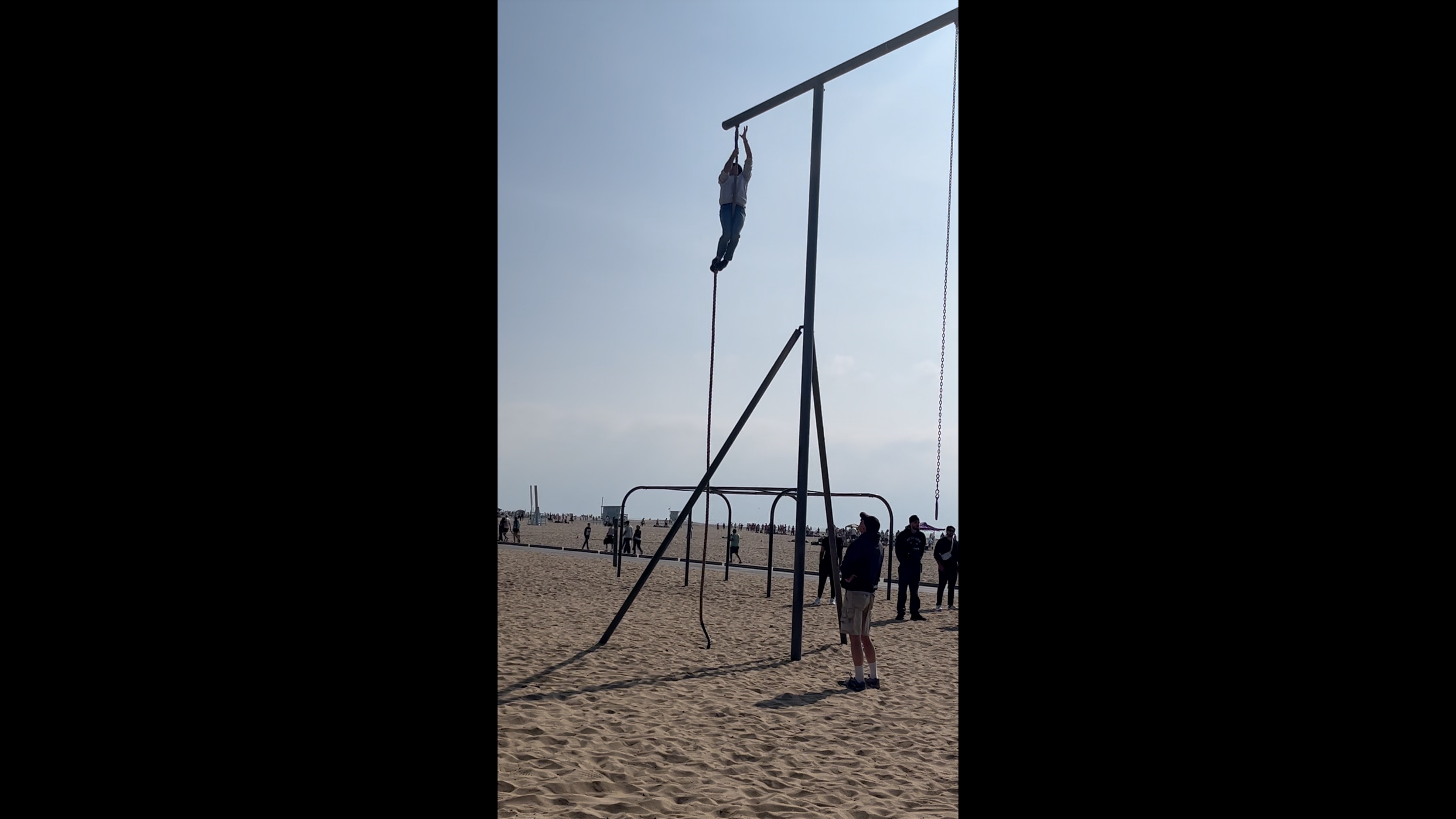Once we were done we rode back to muscle beach to have a play on the equipment. I climbed one of the two large ropes, the first time I climbed to within one meter of the top, decided that I was high enough, and then climbed back down. Another bloke then climbed all the way to the top and back down. Not to be out done I climbed up again and touched the top before coming back down. The other bloke who was climbing the rope had been coming down to climb them for 6 years as a part of his exercise program, he was pretty good. I then saw a group of people swinging on the rings and decided that that looked like fun. When I got there there was a bloke at one end chatting to a group of people I took the opportunity to have a quick go from the other end. I swung through the course and received a disapproving look from the bloke giving the talk. I think that maybe he was some type of fitness coach and that these were his rings and that I had just used them without instruction.
